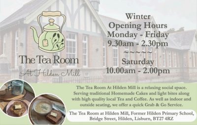 The Tea Room at Hilden Mill is a relaxing social space in the beautifully restored, Historic former Hilden Primary School.